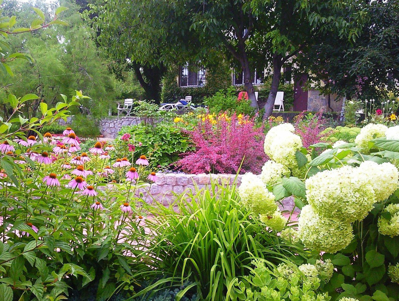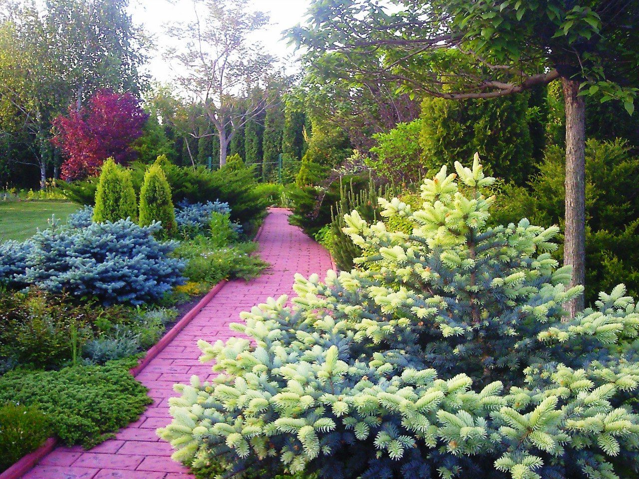 В саду досить оригінальні рожеві доріжки. Біля них ростуть низькорослі кущі пухироплідника калинистого. На газоні можна милуватись ефектною композицією ажурних сумахів, їх гілки дуже прикрашають сад в зимовий період. Коли Світлана Кульбашна працювала над проєктом, то хотіла, щоб природа милувала око не тільки навесні, а й в холодну пору року. Тому до вибору рослин підходила виважено. Навесні кольори змінюються часто, від жовто-білих квітів до помаранчево-синіх. На зміну їх приходять флокси, незабудки, троянди та рододендрони.