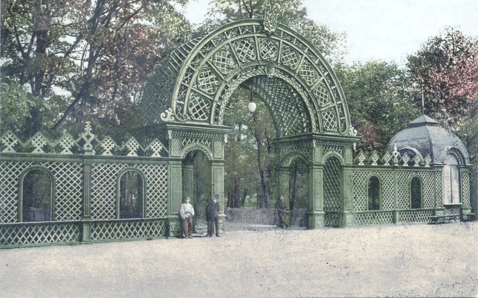 На місці нової колонади центрального входу в парк Глоби на початку 20 століття була красива ажурна дерев’яна арка. 1910 року у зв’язку з проведенням Південно-Російської сільськогосподарської, промислової та кустарної виставки, замість дерев’яної арки побудували великий вхід із колонадою. Він не зберігся. Відомий дніпрянам вхід побудований під час проведення обласної промислової та сільськогосподарської виставки 1949 року.